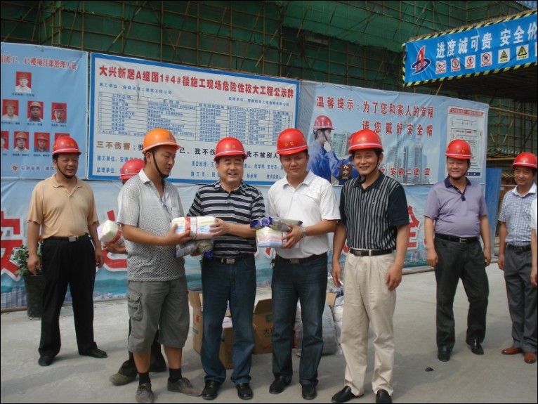 7月17日上午,集團公司黨委書記、董事長胡運成,工會主席、紀委書記牛曙東等一行在安徽二建公司總經理戴樹明、黨委書記朱治淮、工會主席李林等陪同下,冒著酷暑,來到了二建公司承建的大興新居A組團1#、4#項目安置房工地,親切地慰問了生產一線職工,并送去了防暑降溫物品。