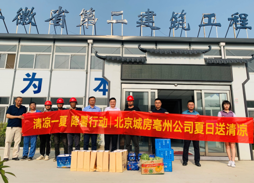 艷陽高照,晴空萬里。6月11日,北京城房亳州負責人刁東良一行蒞臨安徽二建公司亳州濱江壹號項目部送清涼。