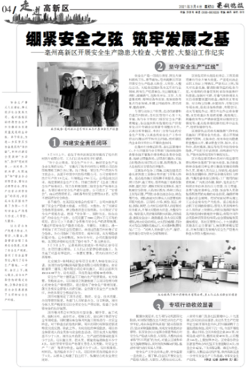 年后復(fù)工不久,亳州市高新區(qū)即對轄區(qū)內(nèi)的施工單位進行逐個復(fù)工復(fù)產(chǎn)以及安全生產(chǎn)隱患大檢查、大管控、大整治。3月3日上午,亳州市高新區(qū)建管主任、第五管理中心主任、環(huán)保中心主任等領(lǐng)導(dǎo)以及亳州市記者來到亳州濱江壹號項目進行實地現(xiàn)場檢查,并采訪了項目經(jīng)理朱曉亮。在聽取項目匯報、查閱安全管控資料后,當?shù)馗髦鞴懿块T領(lǐng)導(dǎo)充分肯定了項目在現(xiàn)場安全、環(huán)保管控等方面的有力舉措,并在亳州晚報上刊登了項目全方位的安全管理體系。