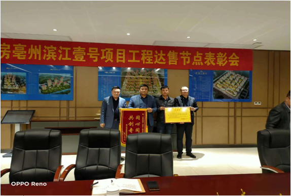 北京城房亳州公司真摯邀請四分公司及項目機關(guān)人員參加濱江壹號項目預(yù)售表彰會,北京城房對二建公司的努力與付出表示肯定與認(rèn)可,并頒發(fā)錦旗與表揚信。