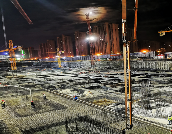 此時,夏風不燥,正是大干好時節。阜陽吾悅廣場工地,人頭攢動,機器隆隆,夜間依舊燈火通明,混凝土泵車猶如出水蛟龍,顛頭播腦,一支建筑大軍正不分晝夜忙碌著,他們為了施工節點正在發起猛攻。