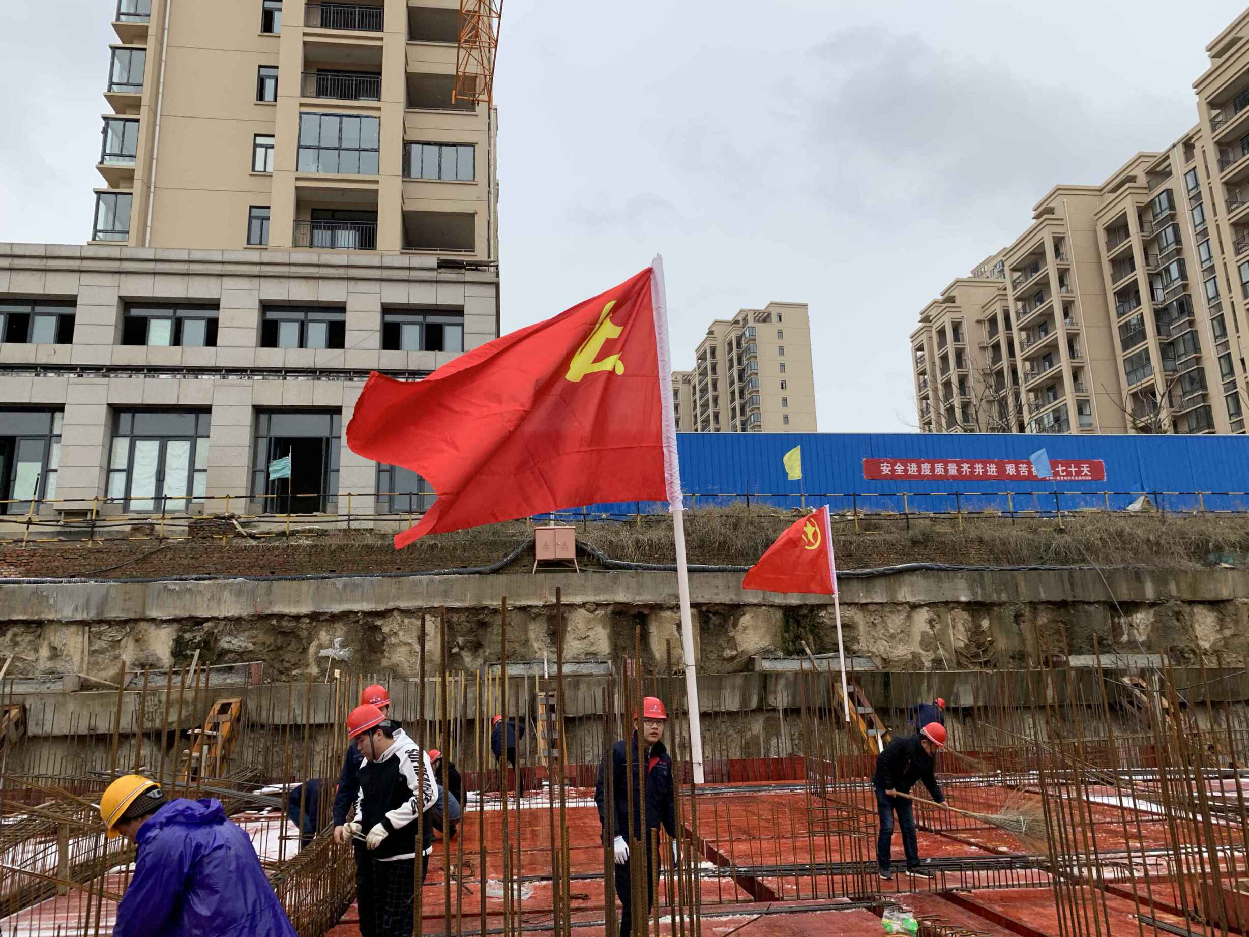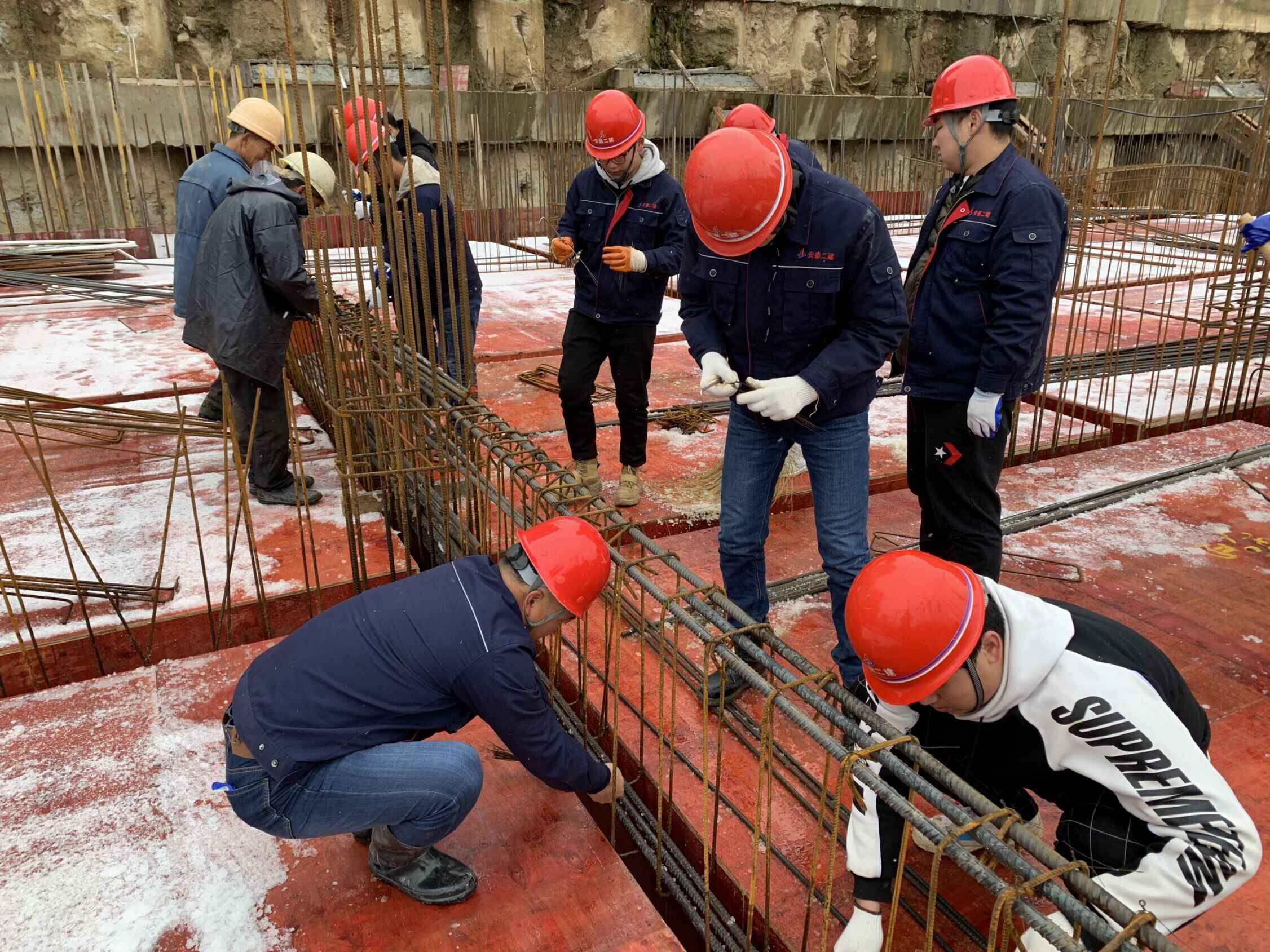 8日,大雪紛紛揚(yáng)揚(yáng)下了一天,為更好的激勵(lì)各班組保安全、促生產(chǎn)。在項(xiàng)目黨支部和共青團(tuán)的帶領(lǐng)下,管理人員與班組工人一同綁扎鋼筋。雖然雪花飛舞,寒風(fēng)刺骨,但大家無(wú)一人退縮,綁扎鋼筋超過(guò)了工人擺放鋼筋的速度。