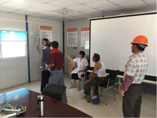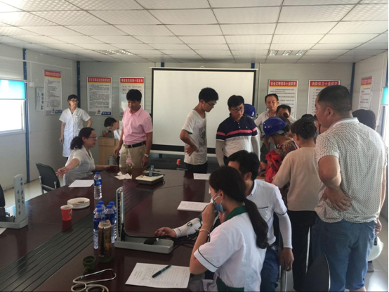 在會議室,工人們有序地排隊進行各項檢查,并不時提出各種健康疑問,醫生耐心的解答并指出夏季作業的注意事項。隨后,體檢結果由項目管理人員分發到工人手里,活動順利結束。