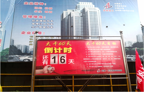 一是強化管理。項目部根據大干目標,制定一系列考評辦法,明確細化責任,充分調動全體職工和班組積極參與大干 “六十天”施工高潮中,攻堅克難圓滿完成大干總目標;二是按照大干 “六十天”活動目標詳細部署施工計劃,對生產任務進行詳細分解,將分部分項工程倒排工期,利用調度會時由各工區長通報日進度;三是領導班子統一思想、轉變思路,因12#樓受拆遷影響,經常與拆遷戶產生摩擦,為不影響進度,項目部要求12#樓施工班組見縫插針迅速投入到勞動競賽中去,投點放線全部任用年輕技術骨干負責,強有力保障現場施工進度;四是施工技術管理人員每天深入生產一線,隨時掌握當天生產施工進展情況和施工中存在的問題,及時采取措施,協調落實;五是在施工大門處安放“大干60天”倒計時牌,讓大家有緊迫感和責任感,同時要求各科室及勞務班組緊緊圍繞公司開展的大干 “六十天”勞動競賽,已安全質量為核心,強化監管,確保安全文明施工再掀施工高潮。
