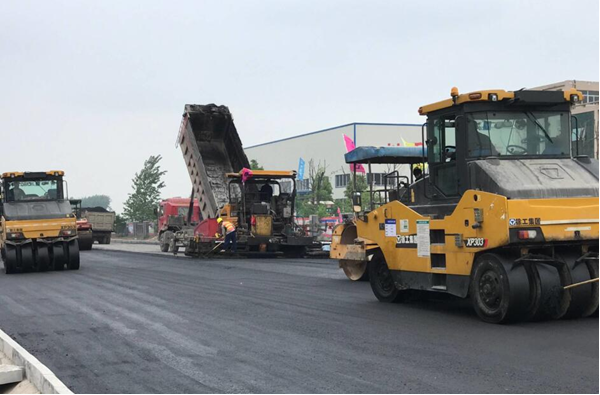 2017年5月3日上午9:58,安徽二建太和市政道路項目現場彩旗飄揚、機器轟鳴,攤鋪機、壓路機、運料車等各種機械設備有條不紊地進行著瀝青路面試驗段施工。