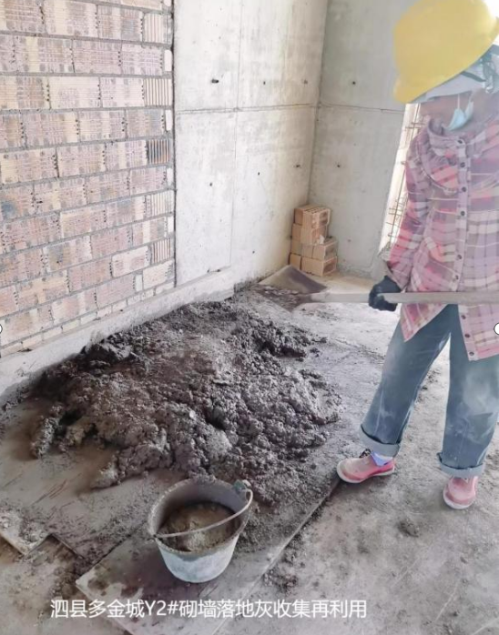此次檢查要求砌筑階段的項目每日發布對落地灰、磚損耗的檢查水印照片于工作群,定期上報檢查情況說明。各項目積極響應,其中泗縣多金城項目在該項檢查中實施效果較為突出,在落地灰集中過篩后,摻少量水泥,利用細料作粉刷刮糙和砌墻的灰漿。落地灰的收集利用,既節約材料、降低工程成本,又有利于施工現場標準化的管理。